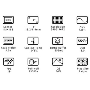 Speciellt för astronomiska tillämpningar har Sony-sensorerna IMX183CLK-J (monokrom) och IMX183CQJ-J (färg) en högkänslig konstruktion med bakgrundsbelysning (BSI) och mycket små 2,4 µm pixlar. För så små pixlar har ASI 183-kamerorna en mycket stor full well-kapacitet på 15 000 elektroner.