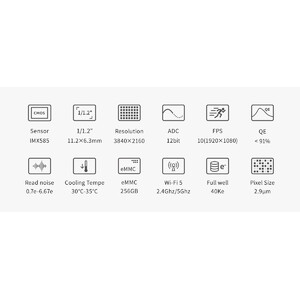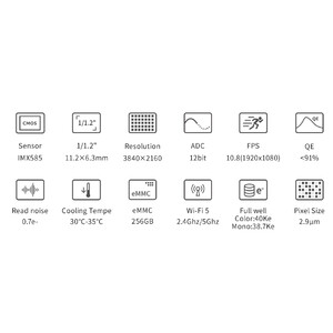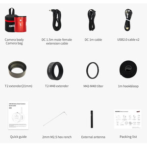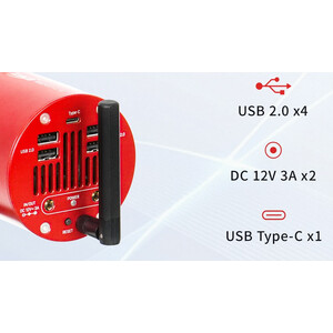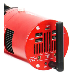 Dualband-WLAN: Den externa dualband-antennen, som stöder både 2,4 GHz- och 5 GHz-frekvenser, möjliggör en stabil och smidig användning av kameran inom 20 meter. Med ASIAir-appen från ZWO styr du kameran och tittar på bilderna enkelt via din Smartphone.