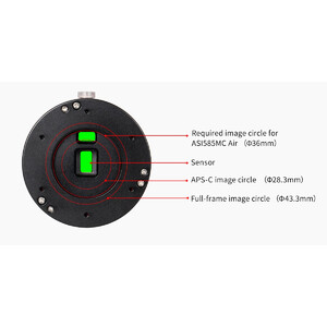 Krav på teleskopet: ZWO Air-kameror är kompatibla med teleskop som stöder APS-C eller större bildformat. Vid användning av ett teleskop med APS-C-bildcirkel kan det uppstå lätt distorsion på ledstjärnan. För en mer exakt och stabilare efterföljning (autoguiding) rekommenderar vi att du använder ett teleskop med fullformat eller större bildcirkel.