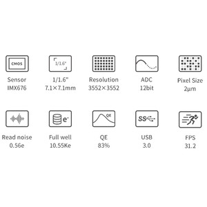 Denna kamera är utrustad med en modern 1,6-tums sensor med 3552*3552 Pixlar. IMX676 erbjuder förutom den moderna Starvis 2-tekniken (med bakgrundsbelysning) en extremt jämn bild utan förstärkarens glöd (Amp-Glow) – men övertygar framför allt med sin mycket höga upplösning på 2,0 µm Pixlar och den relativt höga bildfrekvensen. Kameran är därför särskilt lämplig för följande användningsområden: