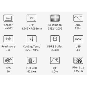 ZWO ASI992MM Pro sätter nya standarder inom SWIR-området: Den kombinerar en specialiserad InGaAs-sensor med hög känslighet i området upp till cirka 1,7 µm, kraftfull tvåstegskylning, lågt utläsningsbrus och solid datalagring.