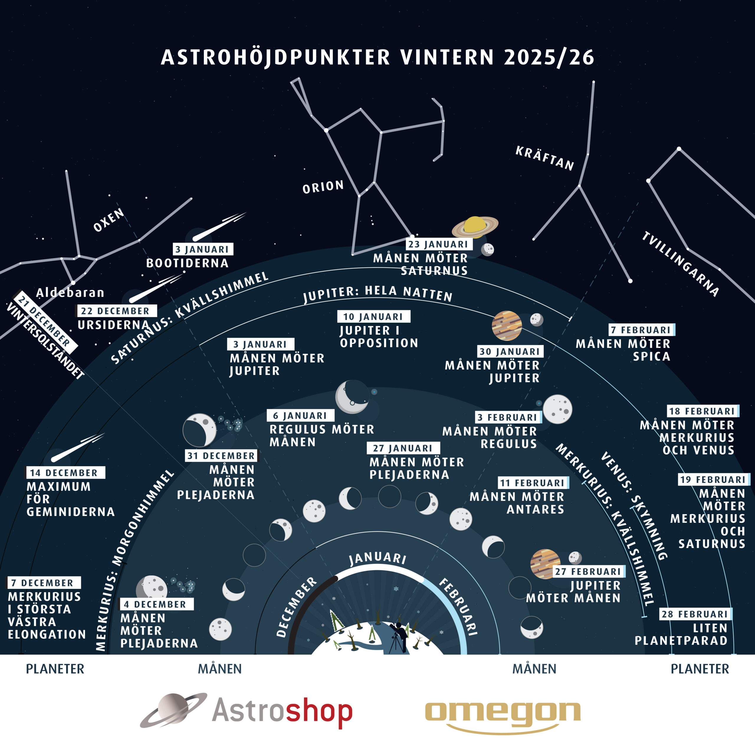 Nu är det dags: vintern börjar och klockan 16 står solen som lägst på hela året. Dagen tar slut tidigt och natten breder ut sig över de resterande timmarna. För många stjärnvänner är detta årets bästa tid: långa nätter lockar fram teleskopet efter jobbet. Från och med nu återvänder ljuset sakta – knappt märkbart, men lite mer för varje dag.