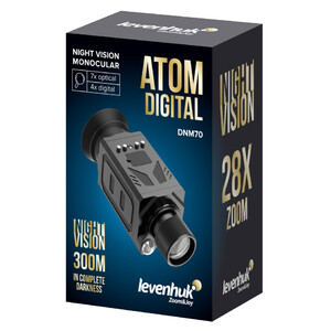 Levenhuk Atom Digital DNM70 Monokular är en pålitlig mörkersikte som är utvecklad för observationer i svagt ljus. Med sin 7-faldiga optiska förstoring och en extra digital zoom på 1-, 2-, 3- eller 4-faldig förstoring gör den det möjligt att observera objekt på natten på ett avstånd på upp till 300 meter. Under dagen ger det dig obegränsad sikt. Det högkvalitativa optiska glaset ger ljusa och skarpa bilder. Ett brett synfält på 20° och en närfokusering på 5 meter gör det möjligt att snabbt sikta in och följa objekt i skogar, öppna områden och stadsmiljöer.