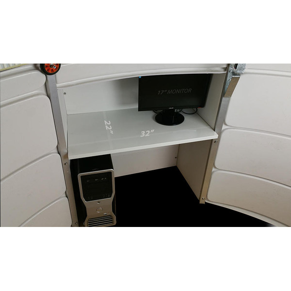 NexDome-facket: Det rymligaste facket i denna observatorieklass: 91 cm (36") brett och 56 cm (22") djupt. Det ger gott om plats för en dator eller kan helt enkelt användas som förvaringsutrymme. Tack vare sin höjd ger den bekväma sittmöbler och benutrymme för att arbeta på datorn. Förvaringsytan erbjuder tillräckligt med utrymme för en stor skärm på upp till 19", tangentbord och mus samt gott om extra utrymme för tillbehör. Avdelningen har utformats enligt samma Modular-koncept som kupolen. Det gör den tålig, lätt, lätt att transportera och enkel att montera. Du kan lägga till upp till sex fack till ett NexDome-observatorium.