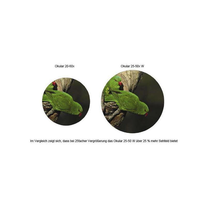 Swarovski Optik har utökat sitt okularsortiment med okularet 25-50x W. Förutom sin låga vikt på endast 295 gram övertygar detta nya vidvinkelzoomokular (synfält 42 m / 1000 m) med sin betraktningskomfort över hela förstoringsområdet. Ett unikt optiskt system med asfärisk lins ger en skarp och detaljrik bild. Precis som alla okular från Swarovski Optik – förutom det nya finns naturligtvis även okularen 30x W och 20-60x tillgängliga – är det vattentätt och kompatibelt med alla kompakta tubkikare i ATM/STM- och ATS/STS-serien.