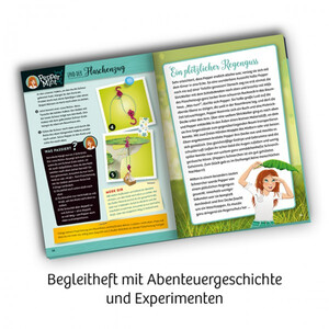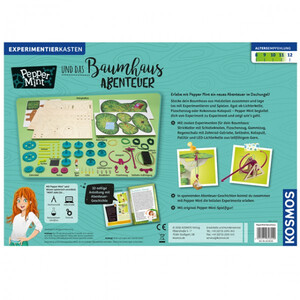 Innehåll: 36-sidig bruksanvisning med illustrerad berättelse, träklossar för att bygga trädkojan, kugghjul, rullar, axlar, gummiband, snören och vev, 4 lysdioder, batterifack, ledande tråd och fjäderstift, stansark, Pepper Mint-spelpjäs. Dessutom behövs: 2 x 1,5 volt batterier av typ LR6 (AA, Mignon).