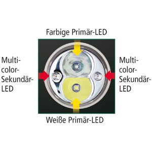 Den färgade primära lysdioden är blå. Den kan ställas in i 3 ljusstyrkor. Särskilt lämplig för sportfiskare och myndighetsbruk, eftersom den blå belysningen inte kan uppfattas av fisk och vätskor är lättare att upptäcka.