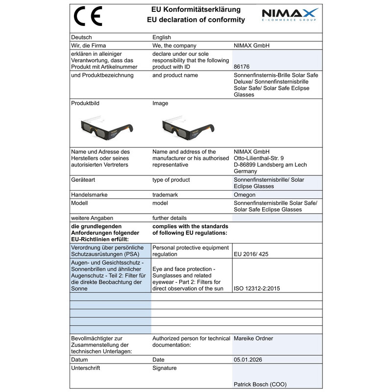 En sällsynt händelse: Månen glider framför solen. Vill du också uppleva det? Omegons solförmörkelseglasögon gör det möjligt. Säkert och utan kompromisser. De speciella solförmörkelseglasögonen skyddar dina ögon perfekt när du utför observationer av solen utan förstoring.