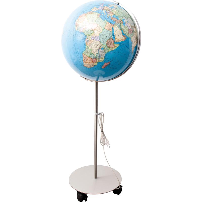 Med en omkrets på över 1½ meter visar denna COLUMBUS-glob utan belysning tydligt den aktuella politiska kartbilden av vår jord. När du tänder belysningen på globen växlar den till den fysiska kartbilden. För enkel hantering har globens fot av rostfritt stål fyra stabila hjul och en praktisk extra lång elkabel. Den låga vikten gör att du enkelt kan lyfta den över trappsteg. Globen har digital information om alla länder och viktiga hav. När du närmar dig globen med ljudpennan hör du information om huvudstäder, ytor, invånarantal etc. ända till befolkningens förväntade livslängd.