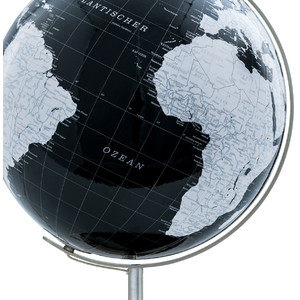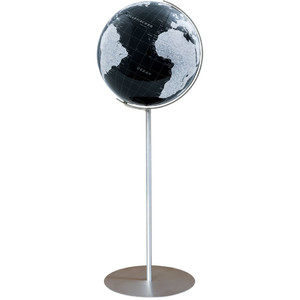 Meridian och fot i högblank krom, kula i akrylglas. Kartbilden är politiskt belysning både med och utan belysning.