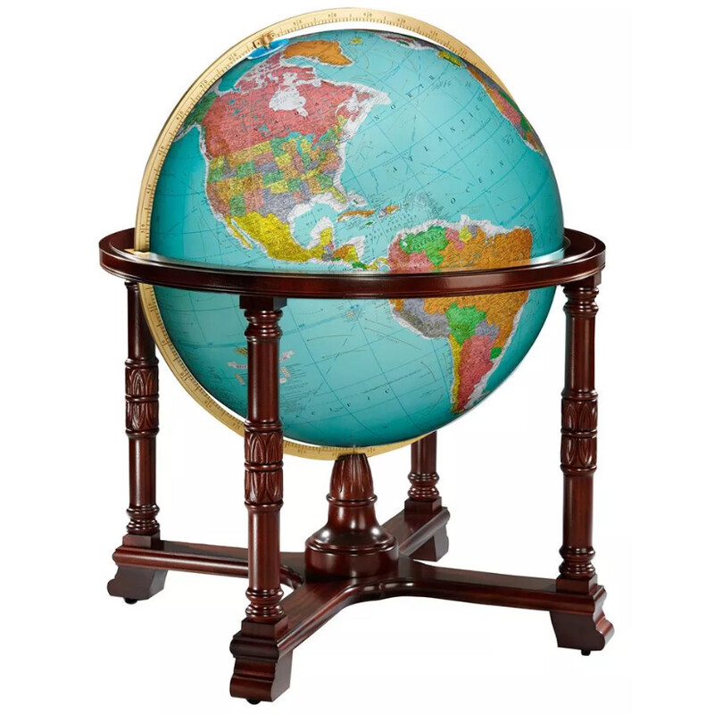 This floor-standing globe becomes a focal point of any library, grandly cradled in a handcrafted mahogany frame that has been rubbed to a lustrous walnut finish and rolls smoothly on four casters.
