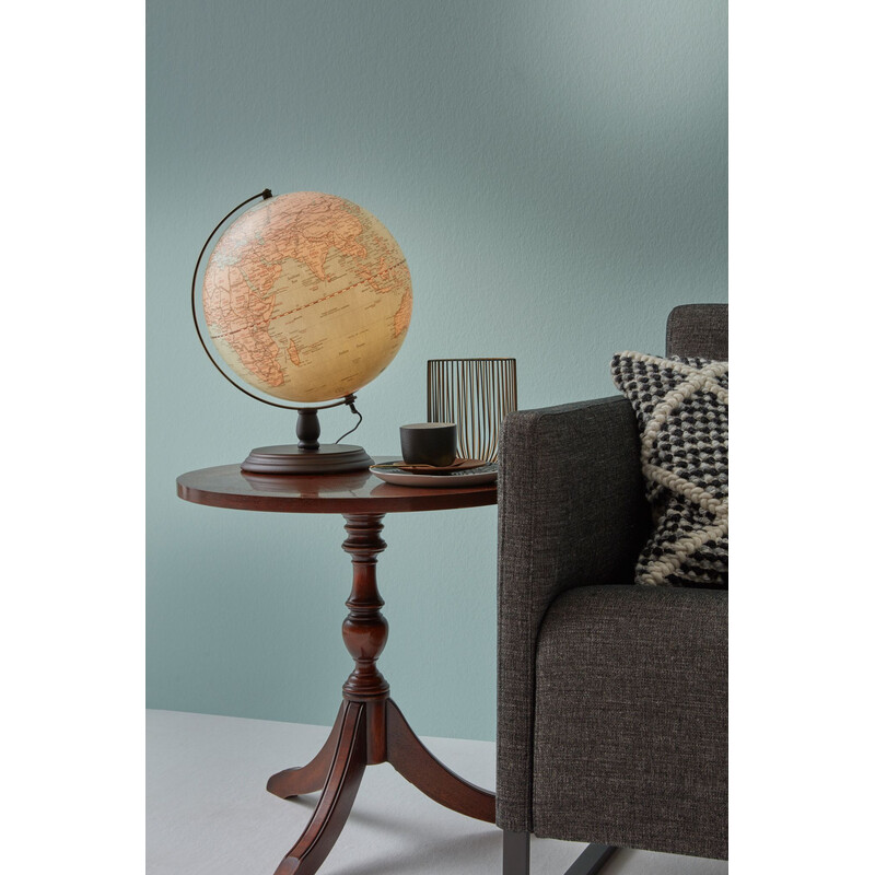 Globen ANTIQUE CIRCLE LIGHT är inspirerad av sekelskiftets klassiska elegans och övertygar med sin säkra stilkänsla. Karaktäristiska detaljer är den vackert formade foten av svarvat trä, det gammalt mässingsfärgade metallstället och den historiska globen i pastellfärgerna blått och rosa.