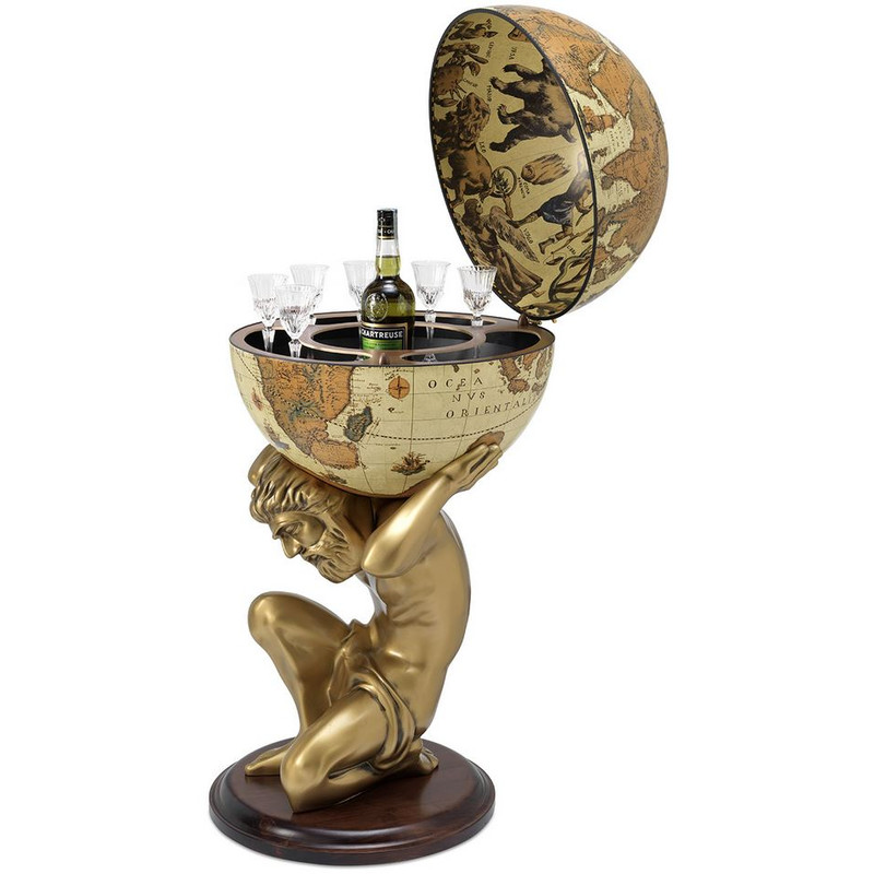 Med inspiration från den grekiska mytologin har Zoffoli utvecklat denna extraordinära globbar i form av en Atlas-staty. Den ca 60 cm höga Atlas-figuren bär den omsorgsfullt utformade jordgloben. En elegant träbas ger stabilitet och ett värdigt utseende. Inuti globen finns plats för ca 2-3 flaskor och upp till 9 glas!