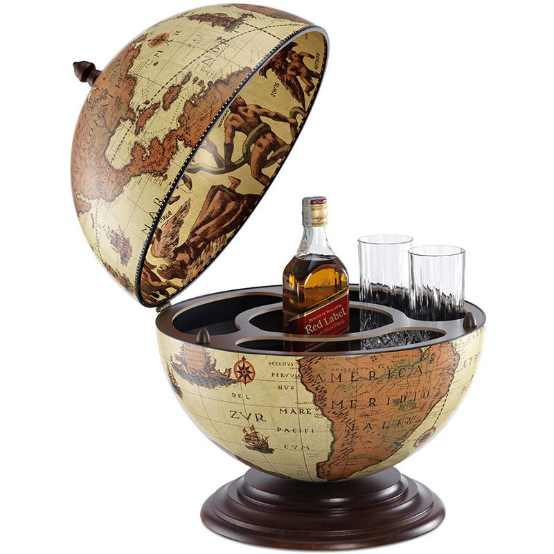 Denna lilla minibar-bordglob har ett förvaringsutrymme för 9 glas och 2-3 flaskor. Kartografin på kartbilden är en replika från 1500-talet.