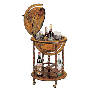 Bar-glob, golvmodell, med vackra illustrationer av sjöodjur, sirener och mytologiska figurer på kartbilden. Glob Regolo har ett fack för 2-3 låga flaskor och cirka 9 glas. Ytterligare flaskor kan ställas på den nedre hyllan, som är dekorerad med en vindros och helt i harmoni med zodiakens tecken runt ekvatorn.