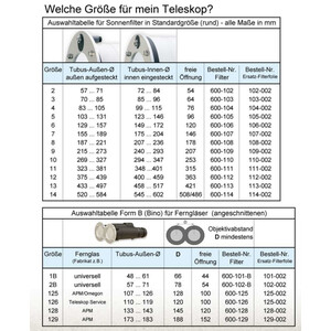 Vilket filter passar till ditt teleskop? I produktnamnet kan du se intervallet för ytterdiametern på teleskopets tub som filtret passar till. Det är inte möjligt att härleda filterstorleken direkt från teleskopöppningen, särskilt som en dagghuv är permanent monterad på många instrument. Det är därför bäst att helt enkelt själv knivar teleskopets ytterdiameter och sedan väljer lämpligt filter.