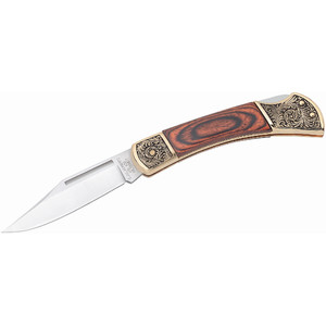 Det mörka pakkaholjet harmonierar mycket vackert med de dekorerade beslagen. Den beprövade gädda-bladet på denna Herbertz fickkniv är tillverkad av rostfritt AISI 420-stål. En klassisk ryggspärr garanterar säkerhet vid användning.