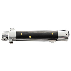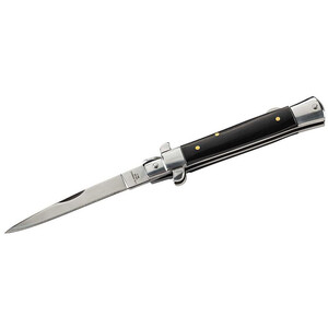 Denna fickkniv från Herbertz är inspirerad av en fällkniv. Stilettbladet i rostfritt AISI 420-stål fälls dock ut från sidan av handtaget med hjälp av en nagelfäste, utan fjäderstöd, och låses där med en ryggspärr. Rostfria käftar och svart micarta bildar det attraktiva handtaget.