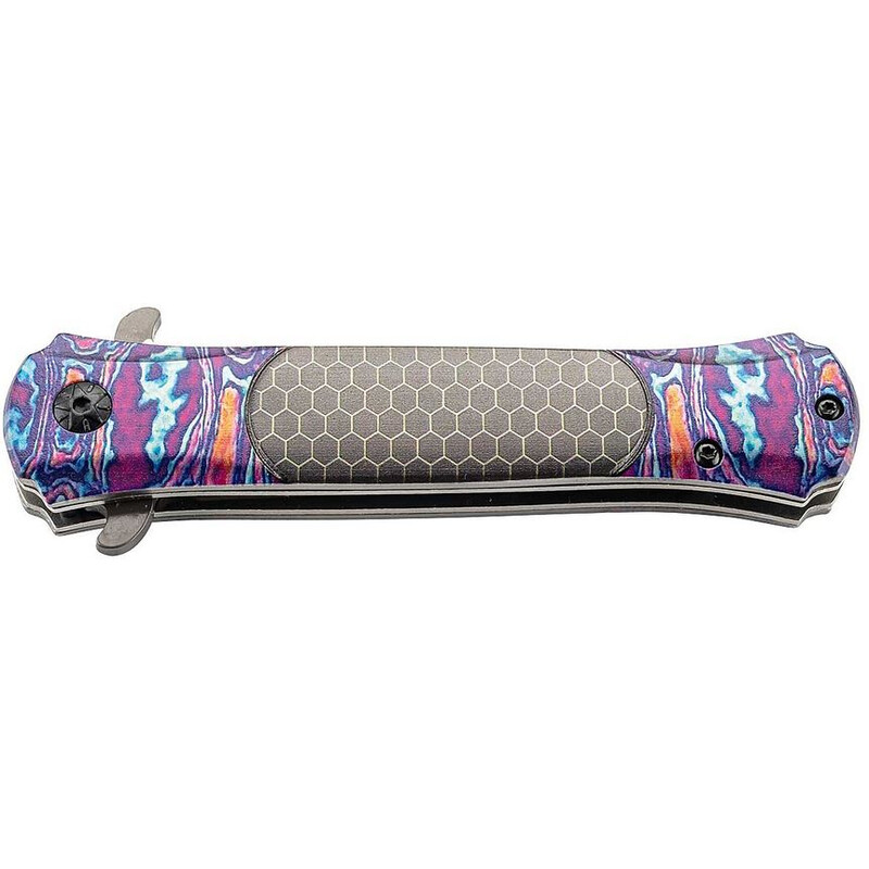 Denna Herbertz enhands kniv är utrustad med en rostfri blad i AISI 420 stål, som kan föras till arbetsläge med hjälp av en flipper. En liner lock-mekanism säkerställer att bladet låses på plats när kniven är öppen. Handtaget i rostfritt stål är förädlat med ett modernt, färgglatt tryck. I leveransen ingår ett praktiskt bältesfodral i svart nylon.