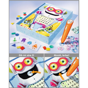 Vad är en triangel? Hur ser en 4:a ut? Vad är 5 + 2? I tiptoi®-spelet "The Hungry Number Robot" löser Kinder matteproblem och matar den hungriga Robby! Beroende på svårighetsgrad lär de sig former eller siffror eller övar sig på aritmetik. För riktiga matteexperter kan talområdet till och med utökas till 20. Den intelligenta tiptoi®-pennan räknar ut och kontrollerar barnens lösningar. När de unga spelarna löser Robbys uppgifter korrekt knackar de med tiptoi®-pennan på chipet och placerar det i Robbys mun - och det försvinner ner i den hungriga robotens mage. Mjamjam!