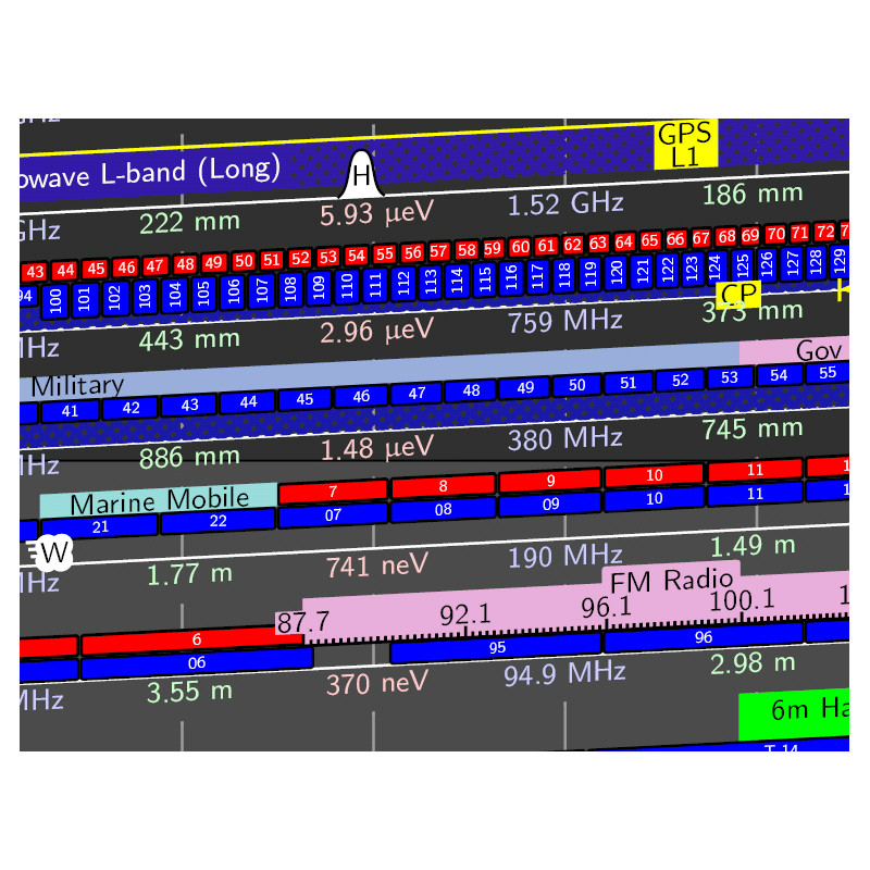 This poster includes all known ranges of EMR including gamma rays, X-rays, ultraviolet light, visible light, infrared, microwaves, radio waves (ULF, VLF, LF, MF, HF, long, short, HAM, VHF, UHF, SHF, EHF), cosmic microwave background radiation and brain waves, all organized by octaves. The audio frequency spectrum is also included.