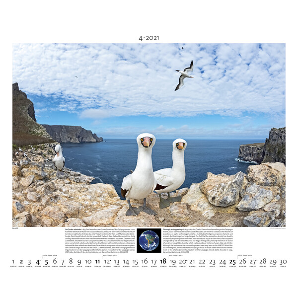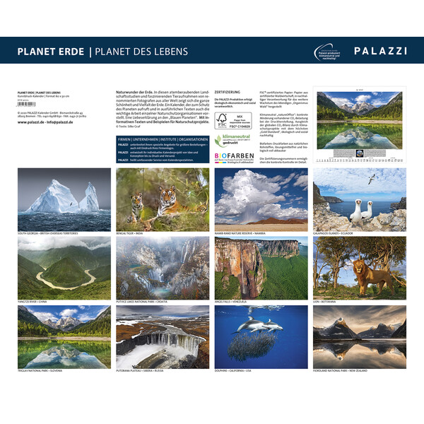 I dessa hisnande landskapsstudier och fascinerande djurbilder av kända fotografer från hela världen visas hela jordens skönhet och mångfald. En kalender som uppmanar till skydd av planeten och i utförliga texter också presenterar det viktiga arbete som enskilda naturskyddsorganisationer utför. En kärleksförklaring till den "blå planeten". Med informativa texter och exempel på naturskyddsprojekt.