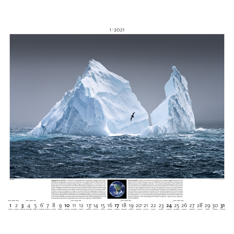 Det generösa formatet på denna väggkalender (60 x 50 cm) gör de 12 imponerande djurfotografierna till sin fulla rätt. Kalendern nedanför är medvetet diskret utformad för att ge motivet mycket utrymme.
