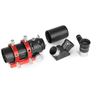 - Optiken är ursprungligen ett guidescope med precisionsfokuserare. Du kan därför enkelt ansluta en guidekamera och använda det för att spåra din astrokamera. Kikaren levereras i guidescope-konfiguration - för att göra om den till en sökare skruvas den loss och sätts ihop igen som visas på bilderna. Detta är en barnlek.