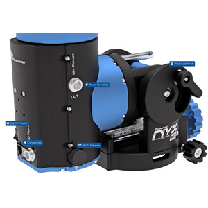 NYX är den antika grekiska gudinnan av natten och Pegasus Astro erbjuder nu under detta namn ytterligare en kraftfull montering med Harmonic Drive-teknik och upp till 14 kg nyttolast – utan att behöva motvikter! Detta säkerställs av Harmonic Drive/Strainwave-tekniken. Drivningen garanterar ett spel fritt gång med högt vridmoment. Ett helt CNC-fräst hölje av aluminiumlegering, svart och blå anodiserat, samt ett urval av högkvalitativa komponenter (stegmotorer, vågväxlar) inuti monteringen garanterar felfri drift under många år.