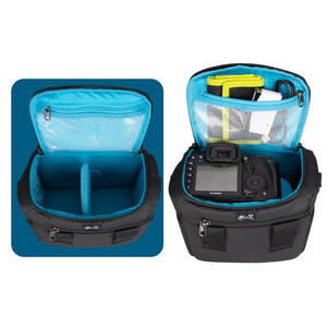 Denna axelväska har plats för en systemkamera eller kompakt DSLR-kamera med standardobjektiv och en blixt eller ett andra objektiv.