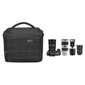 Denna stora axelväska har plats för en systemkamera eller DSLR-kamera med flera objektiv och en blixt eller ett extra hölje. Teleobjektiv upp till 70-200 mm f:2,8