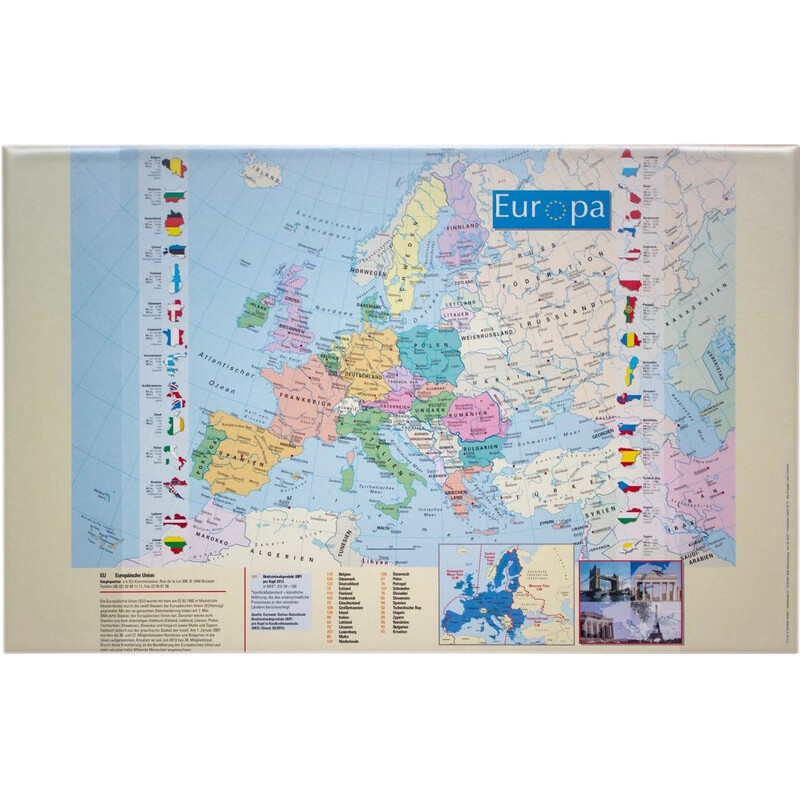 Denna vackra skrivunderlägg med tryckt politisk karta över Europa skyddar inte bara skrivbordets yta mot repor och smuts, utan gör också skrivandet behagligt mjukt och ger armarna en bekväm vila på arbetsplatsen. Fickorna på sidorna gör det möjligt att hålla viktiga anteckningar inom synhåll. Med bilder på landsflaggor och information om landområden, valuta, språk och invånarantal är skrivunderlägget perfekt för skolelever eller för att drömma om nästa semester på kontoret. Det stabila skrivunderlägget är tillverkat av polypropen, vilket gör det lätt att rengöra. Skrivunderlägget är snyggt på alla arbetsplatser och mäter 68 x 44 cm.