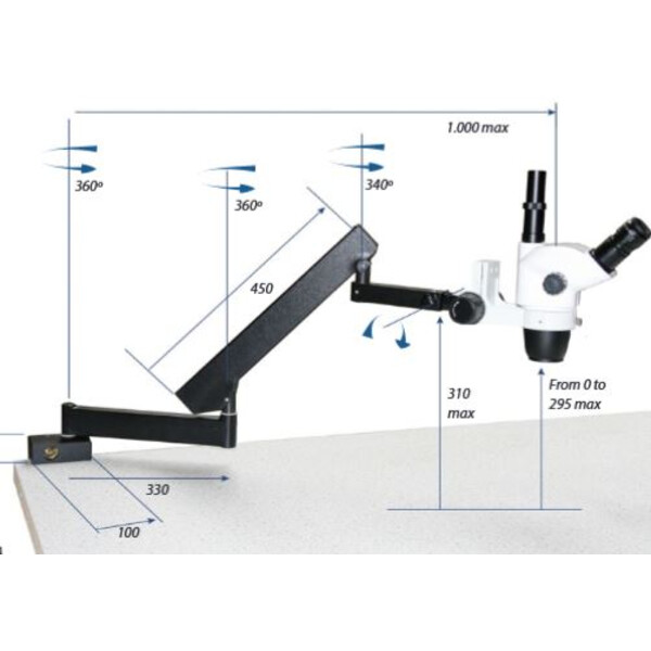 - Stativ: Ergonomiskt utformat pelar- eller kuggstångsstativ med LED-belysning och två objektklämmor eller ergonomiskt utformat överhängande stativ med en eller två armar med grovinställning, utan belysning.