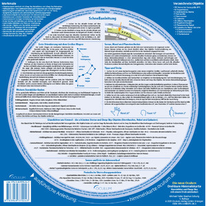 På baksidan finns en förklaring av hur man använder den och ytterligare tips för observation samt data om utvalda himlakroppar och en förhandsvisning av viktiga astronomiska händelser. På baksidan finns också en länk till förlagets hemsida. Där kan du under produkten Drehbare Himmelskarte se den aktuella positionen för solen, månen och planeterna samt den aktuella stjärnhimlen. Med detta tillägg blir himmelskartan tidlös!