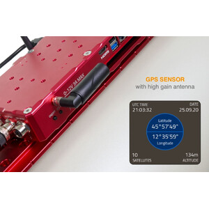 För att kunna använda teleskopet med högsta precision är det mycket viktigt att känna till den geografiska positionen och den lokala tiden. Tack vare den inbyggda GPS-sensorn kan EAGLE nu automatiskt identifiera teleskopets geografiska position, höjd, datum och tid. Den externt monterade högförstärkande antennen gör det möjligt för EAGLE att snabbt och enkelt ansluta till GPS-systemet, även om endast en liten del av himlen är synlig eller om teleskopet står i en planetariums kupol. EAGLE synkroniserar automatiskt alla Windows-inställningar med GPS så att din programvara är direkt klar att användas.