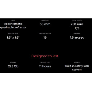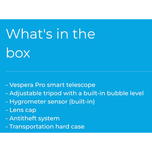 Vespera Pro förenklar astrofotografering genom automatisk inriktning, spårning och fokusering i kombination med avancerad bildförbättring (så kallad stacking). På bara några minuter har du allt klart och kan börja direkt. Med automatisk live-mosaikfotografering är du inte längre begränsad av teleskopets fysiska synfält. Du kan fotografera en större variation av himlakroppar och utforska nya möjligheter för bildkomposition. Med sin högupplösta sensor och live-panoramafotografering är Vespera Pro världens mest mångsidiga smarta teleskop.