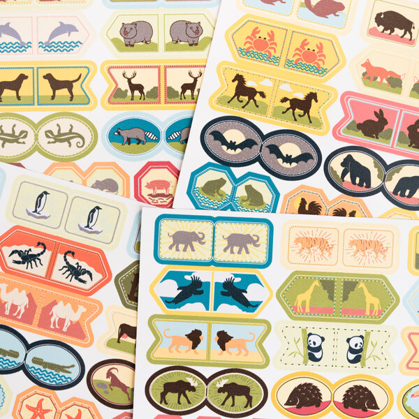 - Set med 64 klistermärken fördelade på fyra ark (förutom bulkpaketet, som innehåller alla fyra set, dvs. 256 klistermärken)