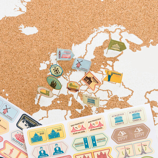 Fyra uppsättningar med 64 klistermärken av de bästa monumenten i världen, den mest utsökta maten, de mest otroliga djuren och alla föremål som gör din resa unik och oförglömlig. Den bästa klistermärkessamlingen för att dekorera din karta med en original touch. Vad väntar du på? Vad är ditt nästa äventyr? Lev det och - framför allt - kom ihåg det med de bästa accessoarerna för dina kort.