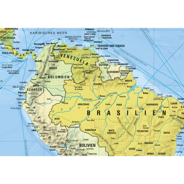 De olika färgade länderna på den politiska kartan är märkta med tyska namn. Dessutom är sjöfartslinjer, hamnar och internationella flygplatser inritade. Bacher-världskartan kompletteras med ett landskapsrelief/skuggning samt ett havsdjuprelief.